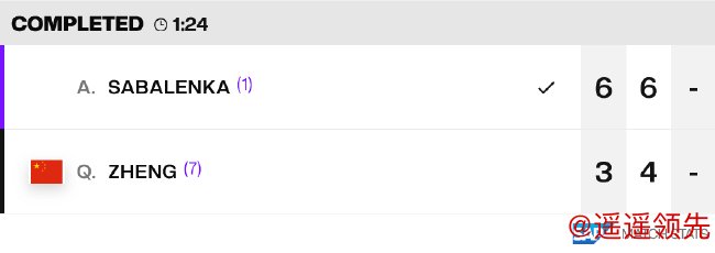 本场比赛,首盘,郑钦文在第六局率先被破发,最终以3-6先丢一盘。第二盘,又是萨巴伦卡在第九局率先破发,在拿下发球胜赛局后,以6-4再下一城。