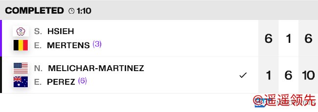 在率先进行的一场绿组女双比赛中,3号种子谢淑薇/梅尔滕斯用时1小时10分钟,皇冠体育在先胜一盘的情况下,连丢两盘,以6-1/1-6/6-10遭去年亚军、6号种子梅里查尔/佩雷兹逆转,无缘小组首胜。